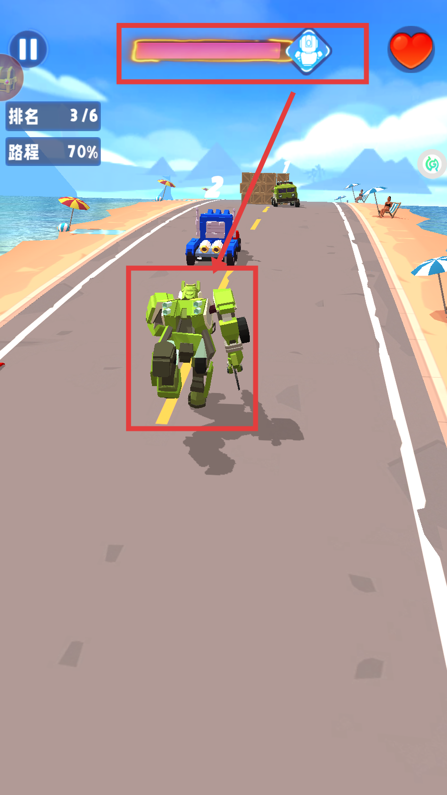 3、当能量进度条充满时,车辆会变形为【绿色机器人】,战力增强,助力后续赛程。