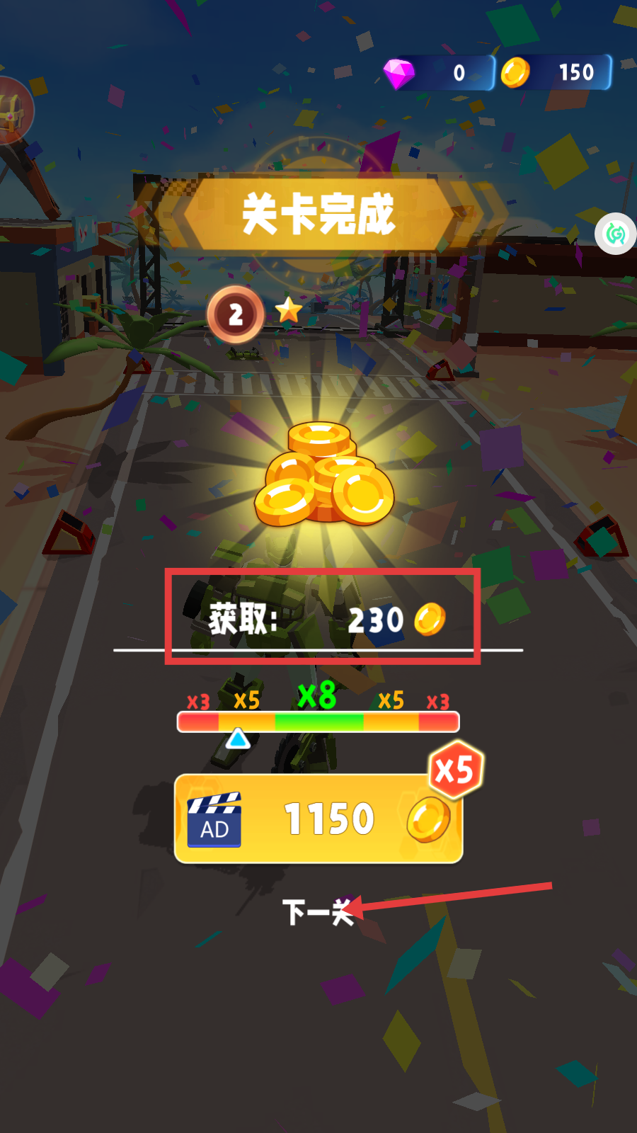 4、成功完成关卡后,可获取【230】金币奖励,点击“下一关”,继续挑战新的赛道。