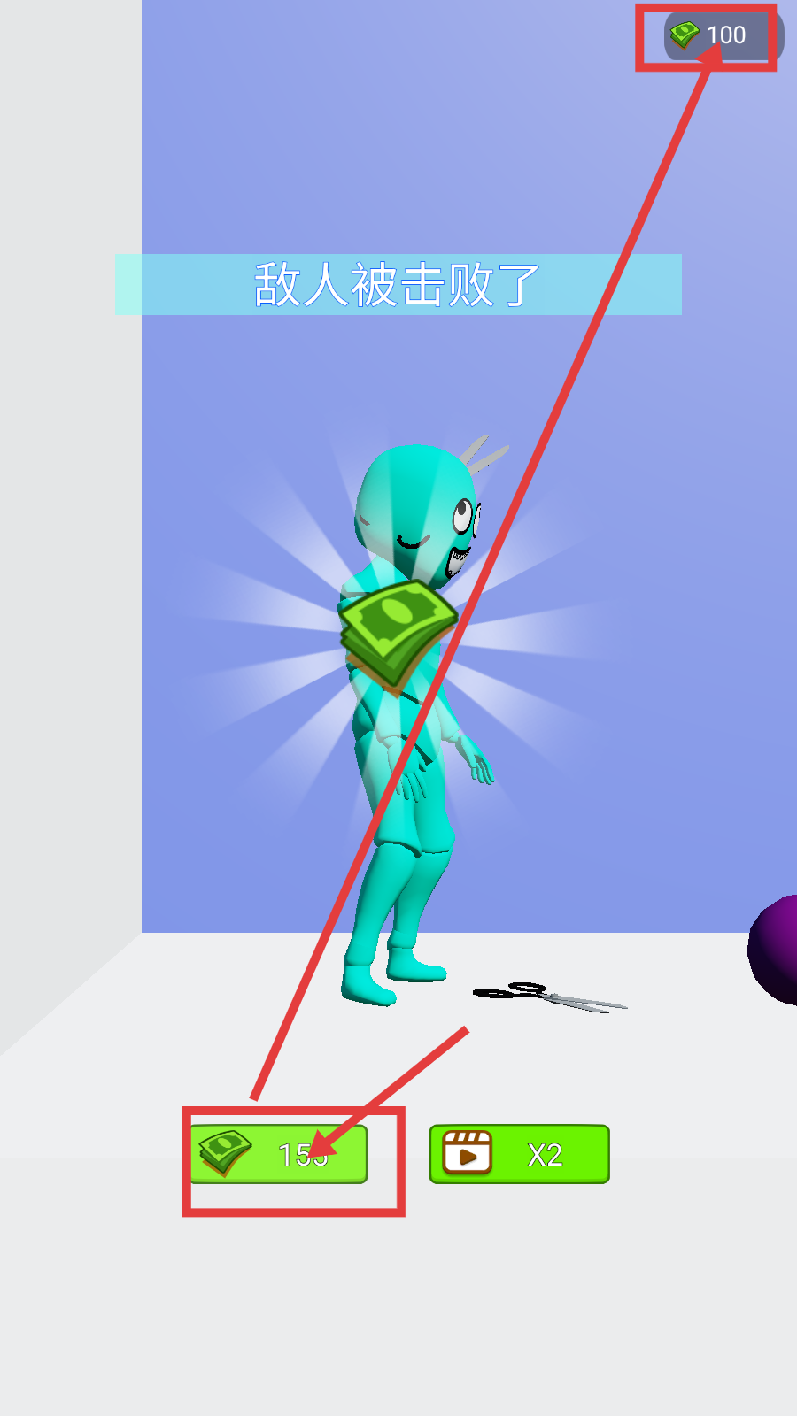 4、击败敌人后,可获取【155】金币奖励,金币总数增加,用于后续游戏强化。