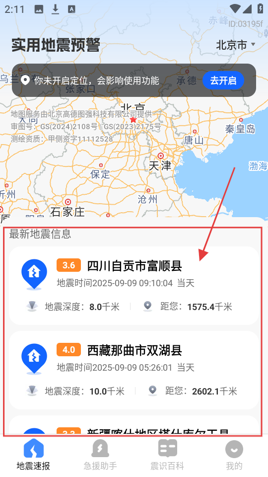 1、进入实用地震预警页,可查看最新地震信息,如【四川自贡市富顺县】等地震的震级、时间等内容。