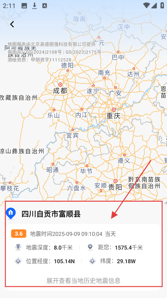 2、点击具体地震条目,如【四川自贡市富顺县】,能查看该地震更详细的经纬度等信息,还可展开看当地历史地震信息。