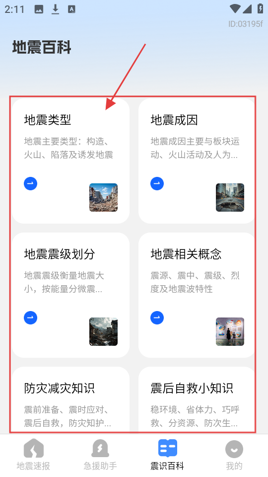 3、进入震识百科页,有【地震类型】【地震成因】等分类,选【地震类型】,查看地震类型相关知识。