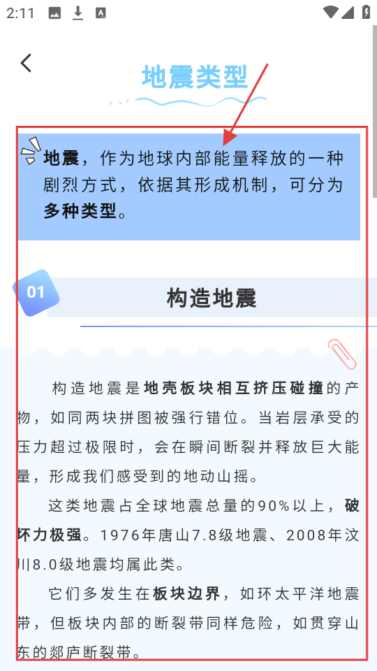 4、在地震类型详情页,可了解构造地震等不同地震类型的形成机制、占比及典型案例等内容,学习地震知识。