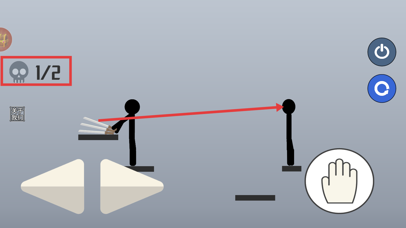3、操控拿武器的火柴人,攻击场景里的敌方火柴人,此时击败数会从【0/2】变为【1/2】,持续推进击败目标。