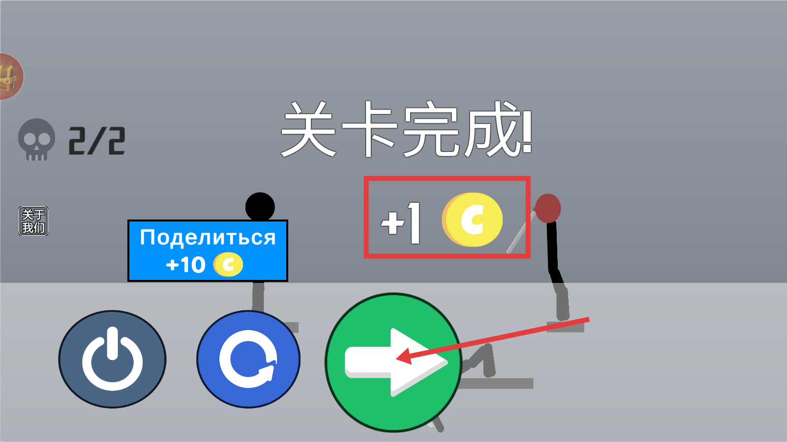 4、当击败数达到【2/2】时关卡完成,会获得【+1】金币,点击绿色箭头按钮就能进入下一关。