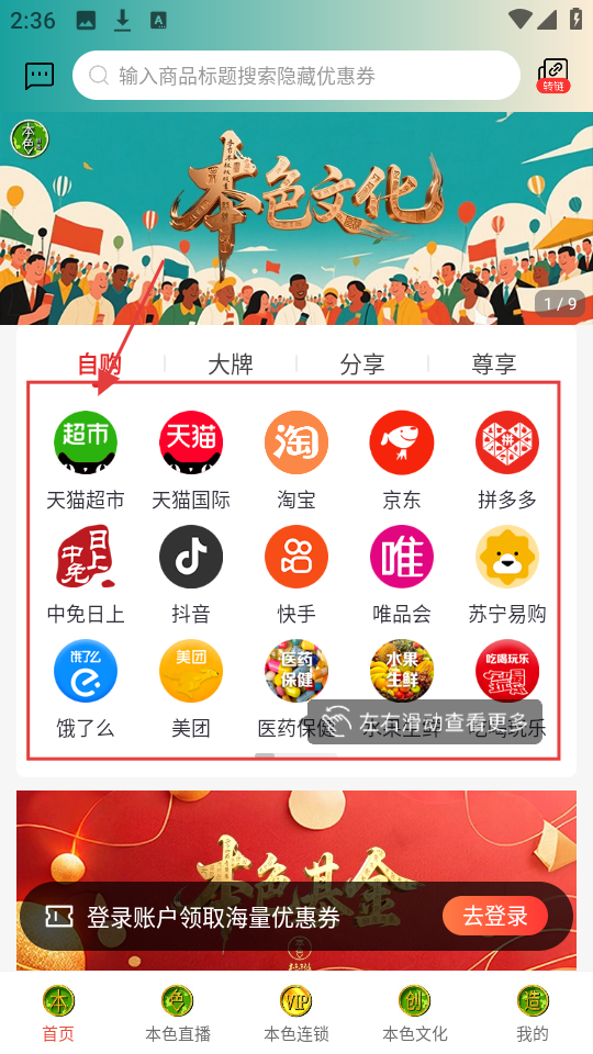 1、进入首页,有【天猫超市】【天猫国际】等平台入口,选【天猫超市】,进入其优惠攻略页。