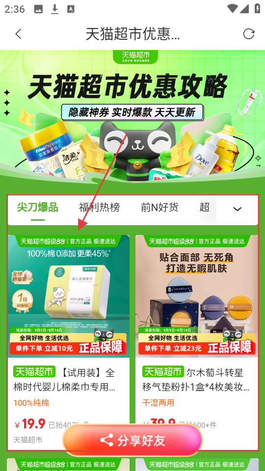 2、在天猫超市优惠攻略页,有【尖刀爆品】等分类,选心仪商品,查看详情,可分享好友或自购。
