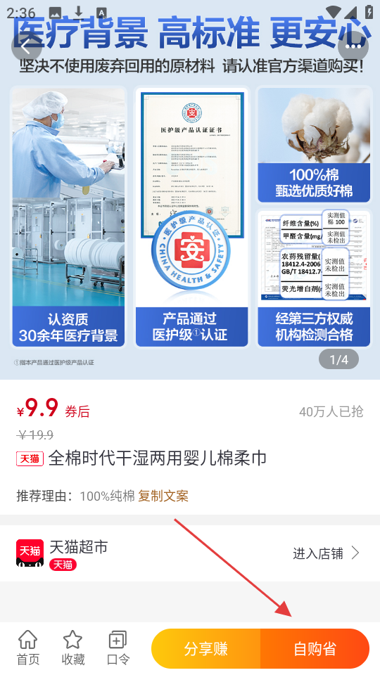 3、在商品详情页,了解商品医疗背景、认证等信息,若要购买,点【自购省】,进入购买流程。
