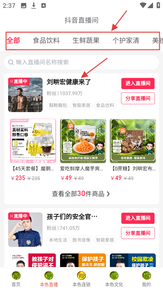 4、进入抖音直播间页,有【食品饮料】等分类,选【刘畊宏健康来了】直播间,可进入或分享直播间。