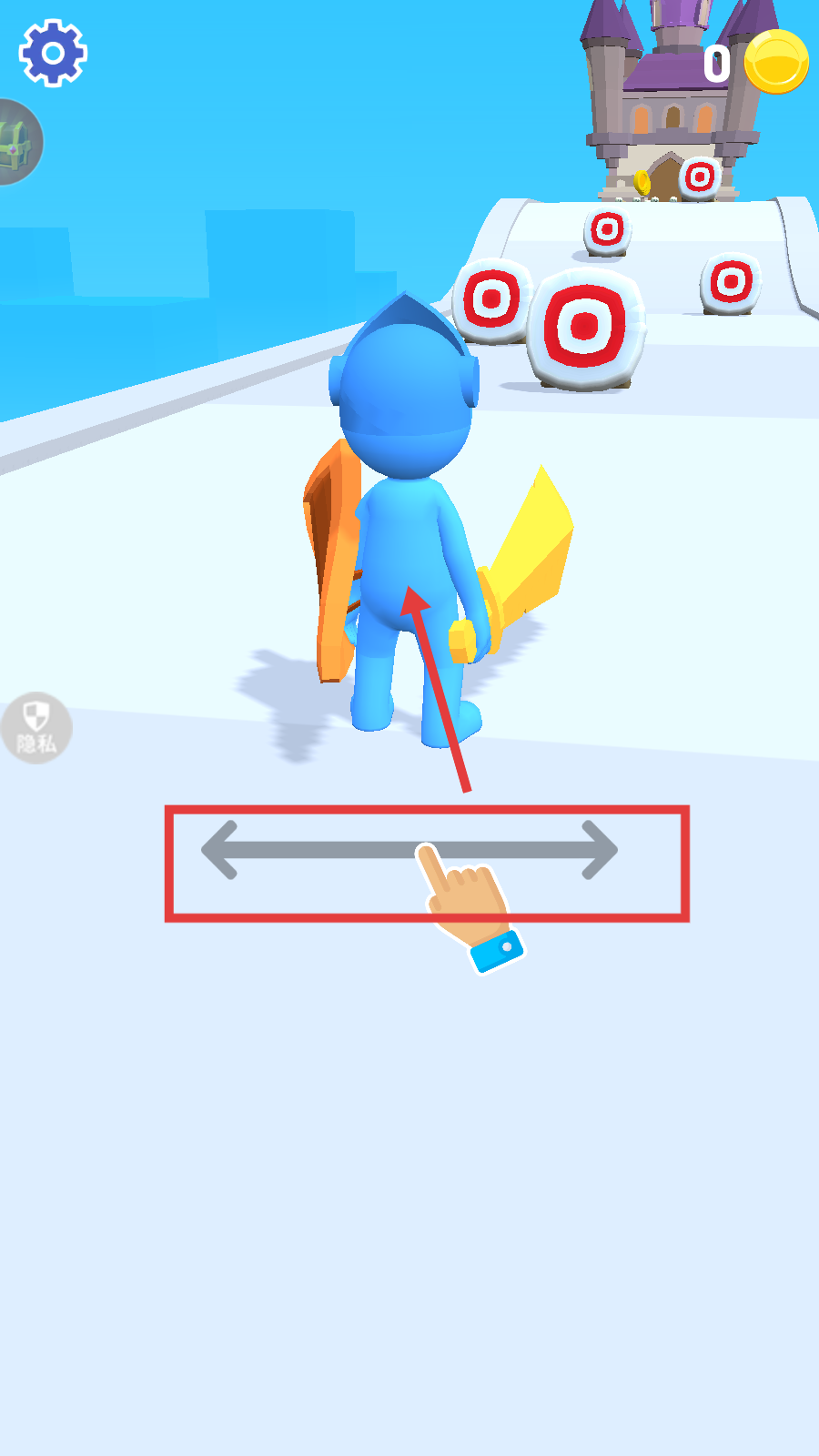 1、操控蓝色角色时,滑动下方左右箭头,可灵活移动角色,朝着前方靶标方向前进,准备开启挑战。
