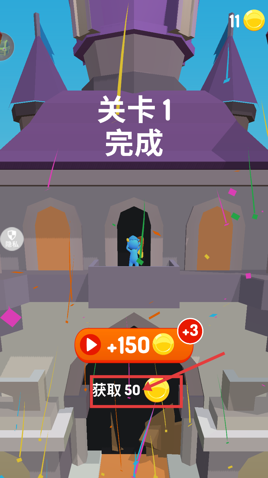 4、成功完成【关卡1】后,可获取【50】等大量金币奖励,这些金币能用于后续强化角色或解锁内容。