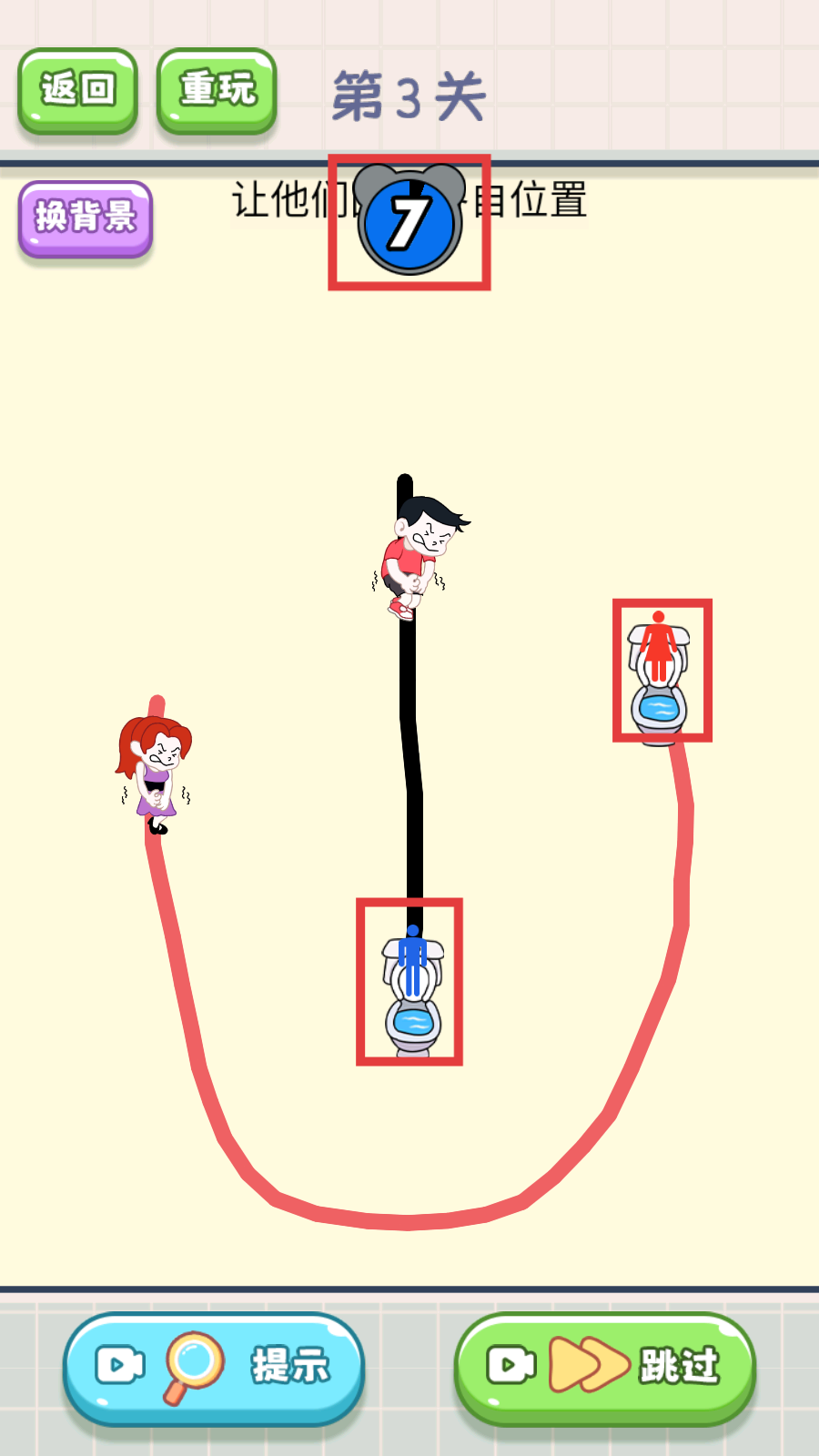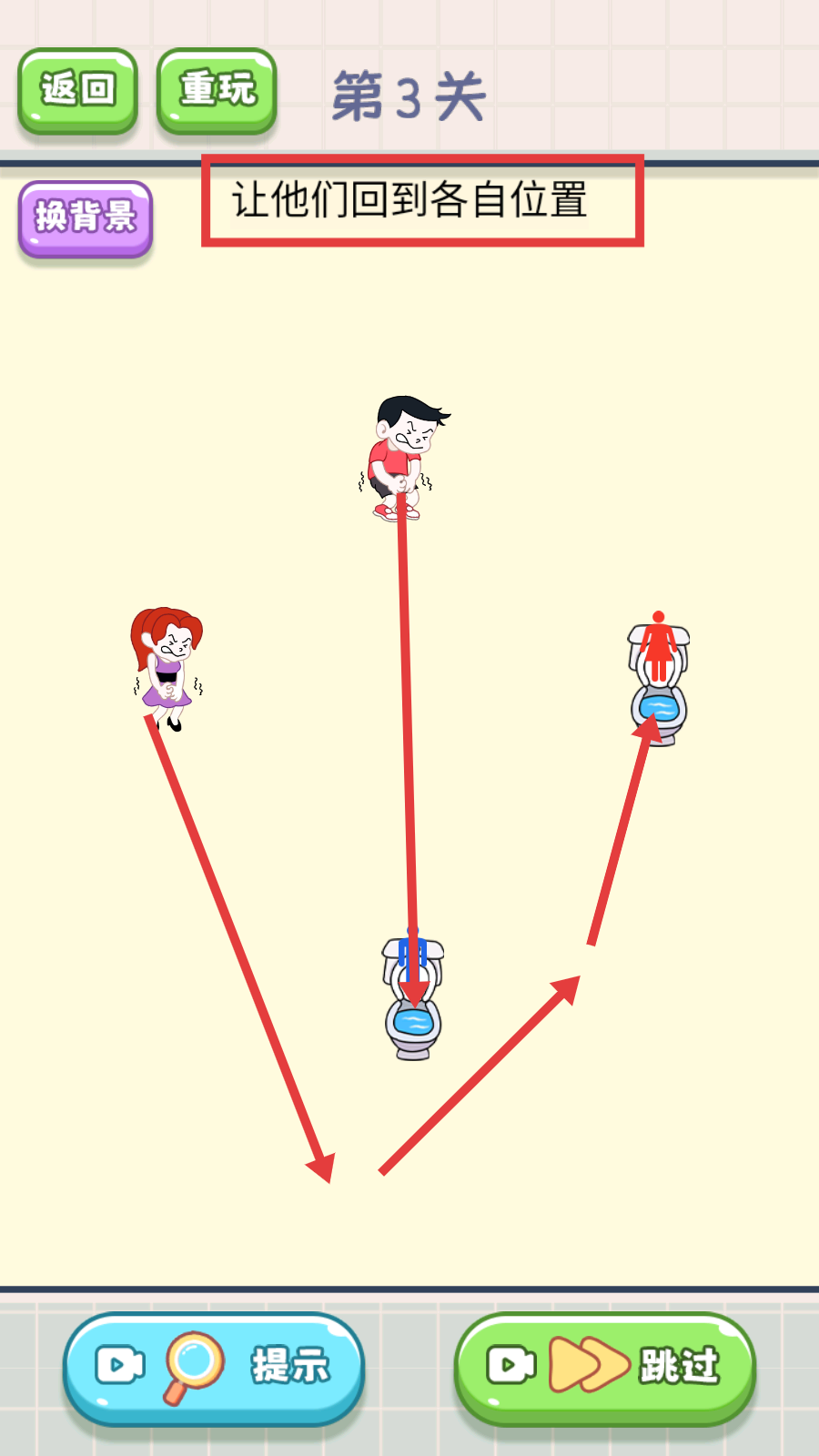 2、在【第3关】中,明确任务是“让他们回到各自位置”,需观察男女角色与对应马桶的位置关系,准备规划路线。