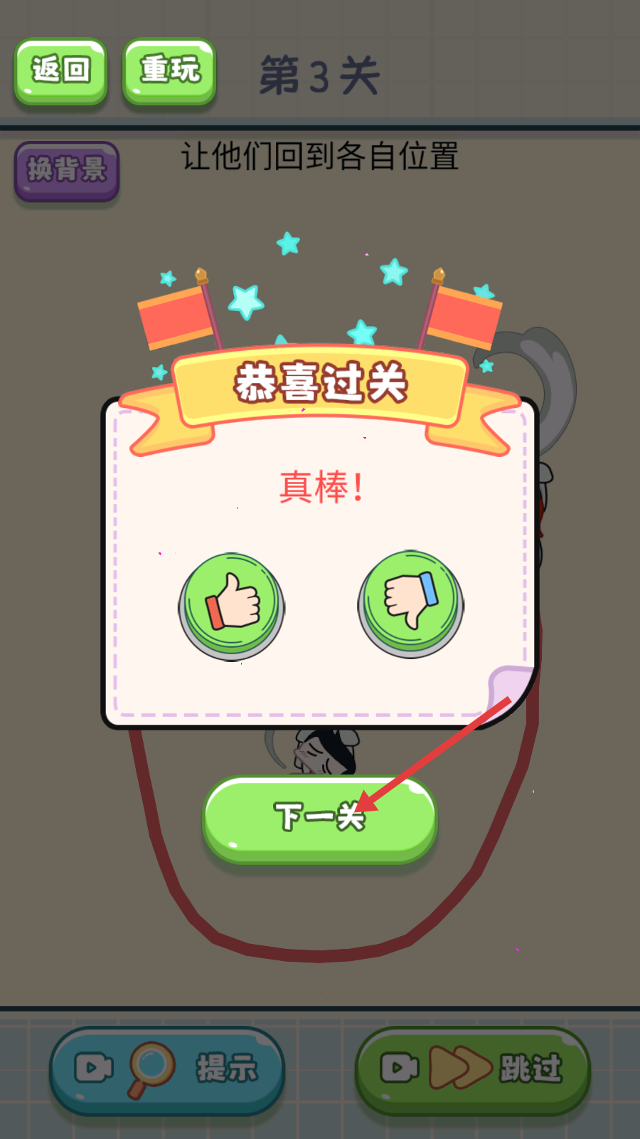 4、成功通关后,点击【下一关】按钮,继续挑战后续关卡,不断体验新的游戏内容。