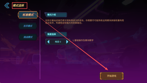 2、如何选择模式?点击“标准模式”查看简介,再点“开始游戏”即可进入教学关卡。