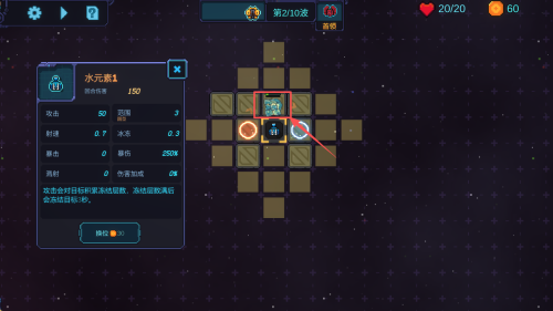 4、如何查看战局信息?顶部显示“第2/10波”与“20/20生命”,点击“水元素1”可查看攻击速度与冰冻层数效果。