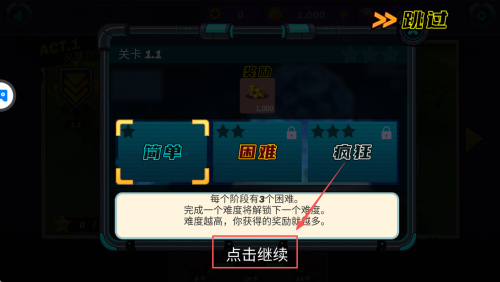 3、如何选择难度?在“关卡1.1”界面点“简单”“困难”或“疯狂”,完成低难度自动解锁下一难度,奖励随之提升,点“点击继续”确认。