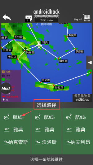 2、如何规划航线?在地图上拖动调整视角,点击“雅典→纳克索斯”等航线,再按“选择路径”即可确认飞行路线。