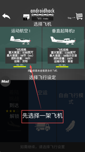 3、如何选择飞机与模式?在“选择飞机”界面点“运动航空1”或“垂直起降机2”,查看规格后点“自由飞行模式”,再按“到达”继续。