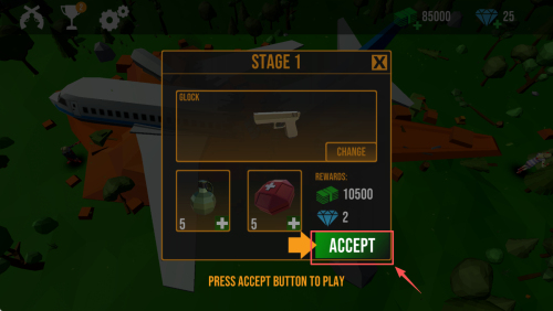 2、如何接受任务?选择“STAGE1”后查看奖励信息,点击右下角的“ACCEPT”按钮即可开始挑战。