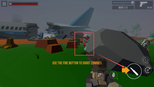 3、如何射击僵尸?进入战斗后,在第一波尸潮中使用右下角的“开火”按钮射击僵尸。
