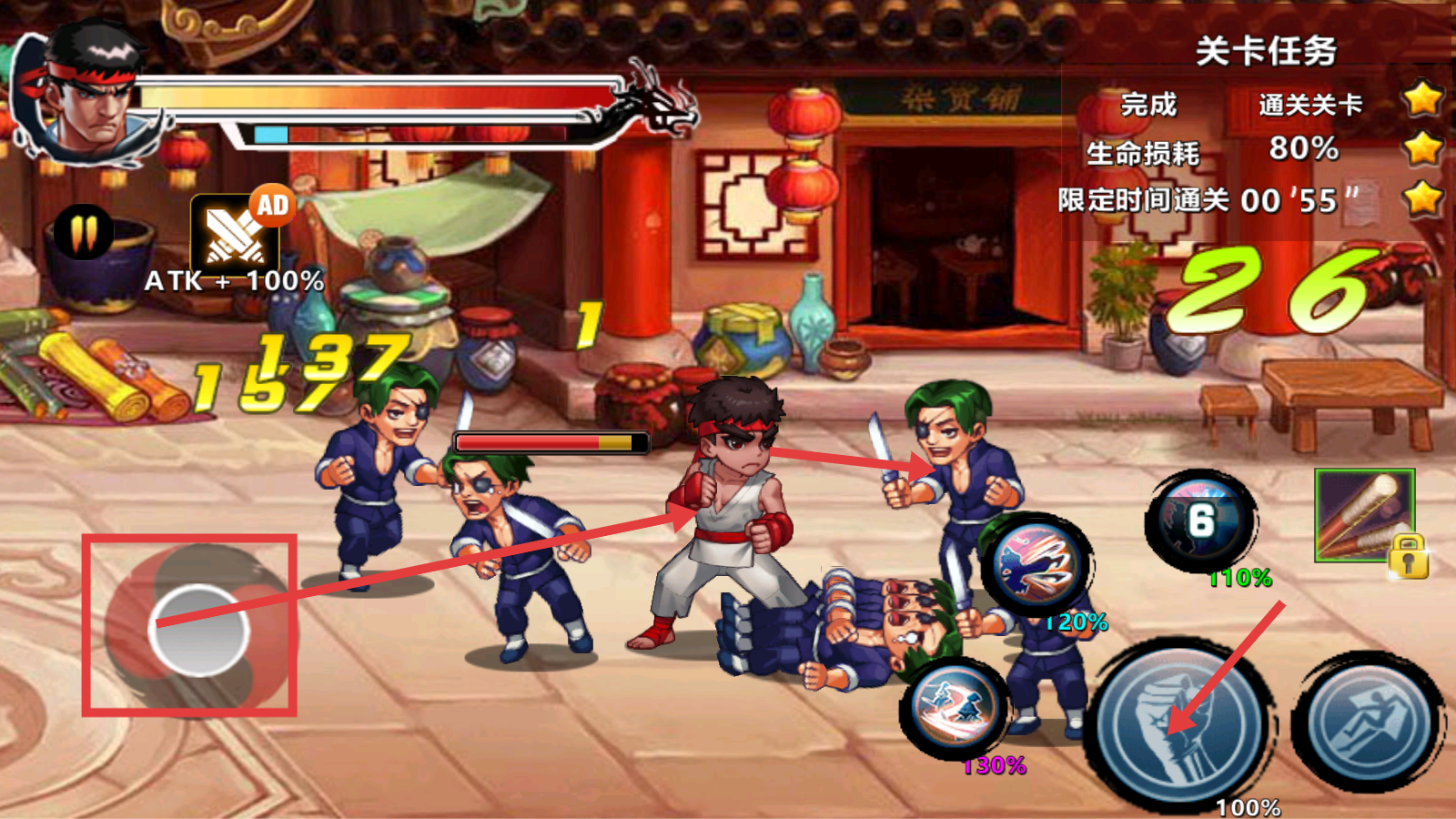 2、战斗时,通过左侧摇杆控制角色移动,点击右侧拳头图标进行普通攻击,应对敌人的进攻。