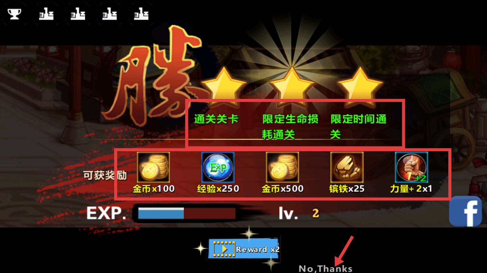 4、通关关卡后,能获得【金币-x100】【经验-x250】等奖励,达成三星条件可获取更多资源。