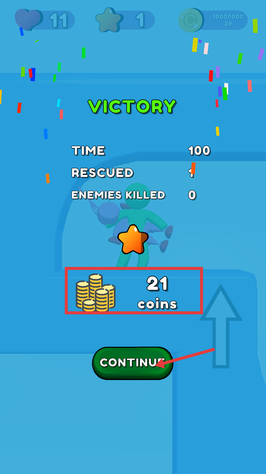 4、成功通关后,会获得【21-coins】等奖励,点击【CONTINUE】按钮可继续挑战下一关。
