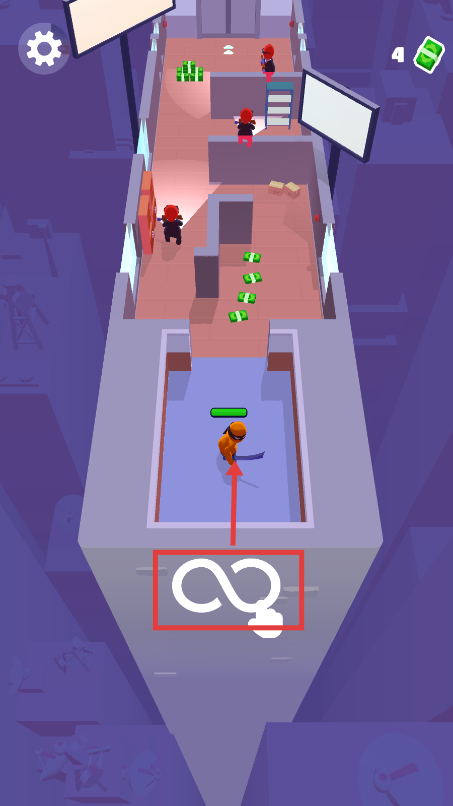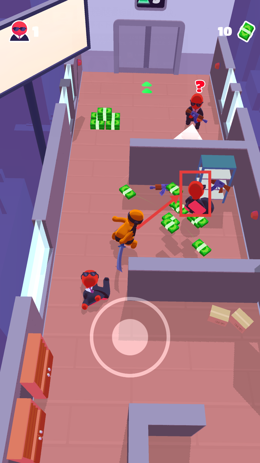 2、遇到红色敌人时,找准时机发起攻击,击败敌人可获取其周围的钞票,以此积累资源。
