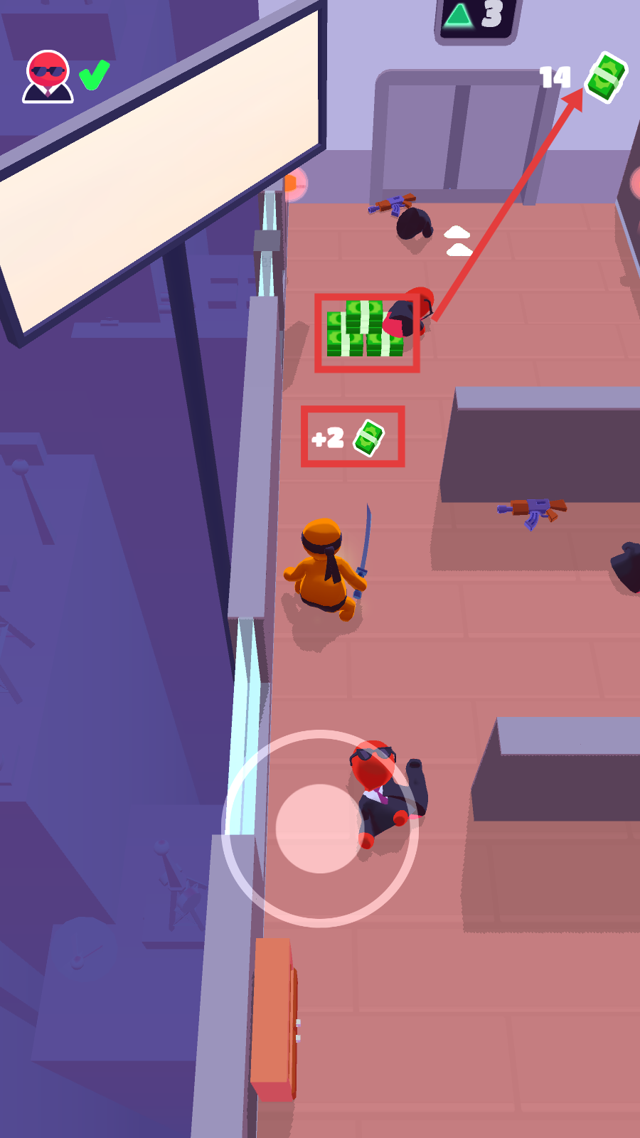 3、场景里的成捆钞票和散落钞票都要收集,这能提升右上角的钞票数量,助力达成通关目标。
