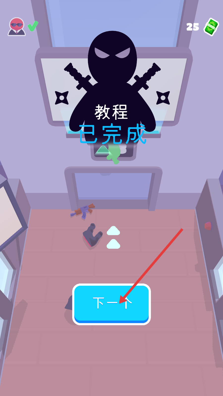 4、完成教程关卡后,屏幕显示【教程-已完成】,点击【下一个】按钮,即可继续挑战后续关卡。