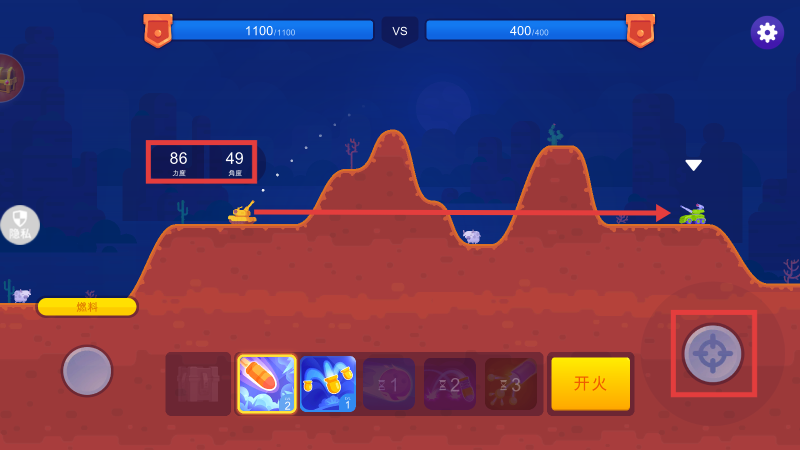 2、战斗时,通过右侧瞄准控件调整瞄准方向,结合【86-力度】【49-角度】数值,精准瞄准敌方坦克。