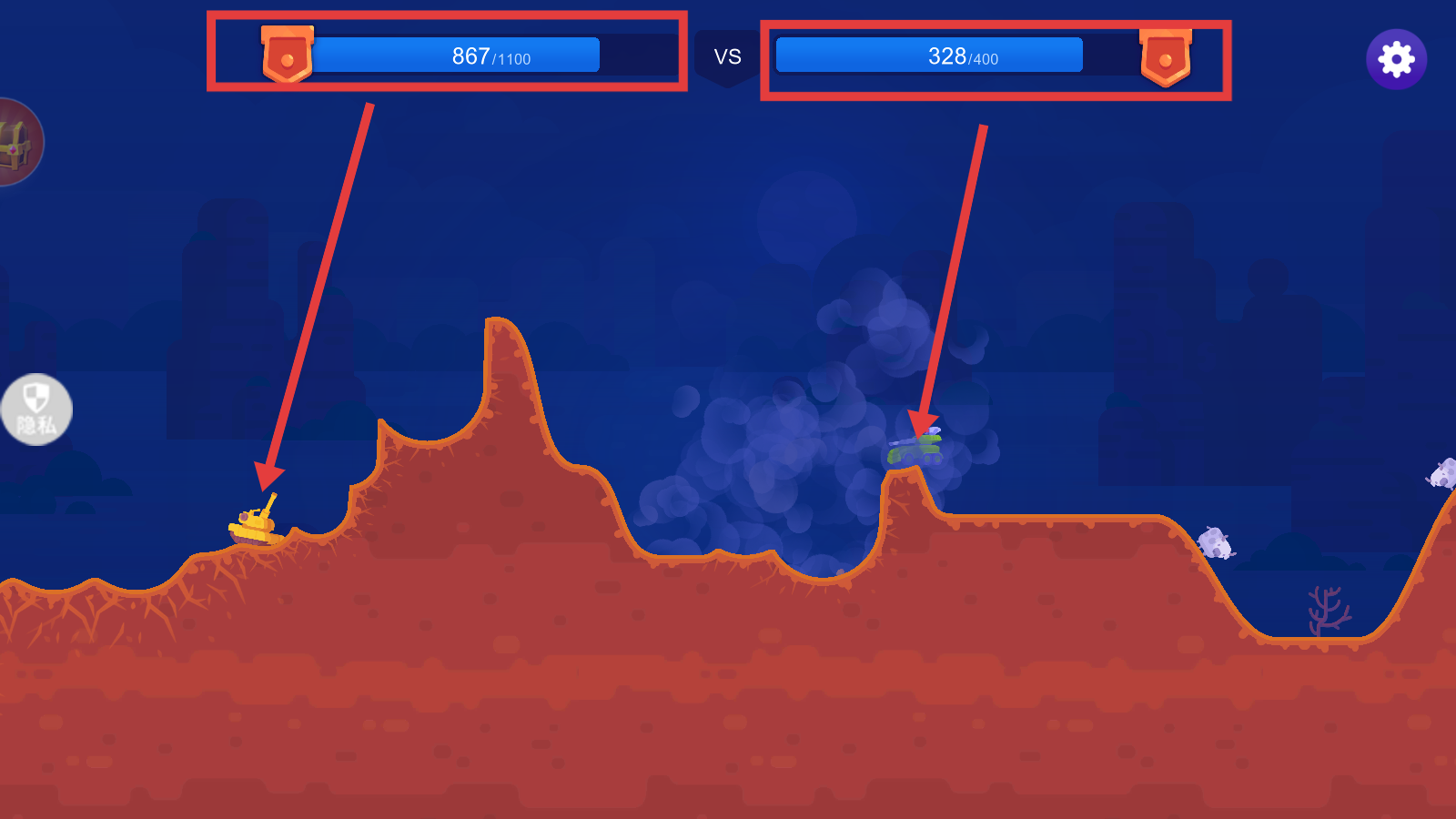 3、瞄准后点击【开火】,攻击敌方坦克,可观察到自身与敌方的血量条变化,持续打击削减敌方血量。