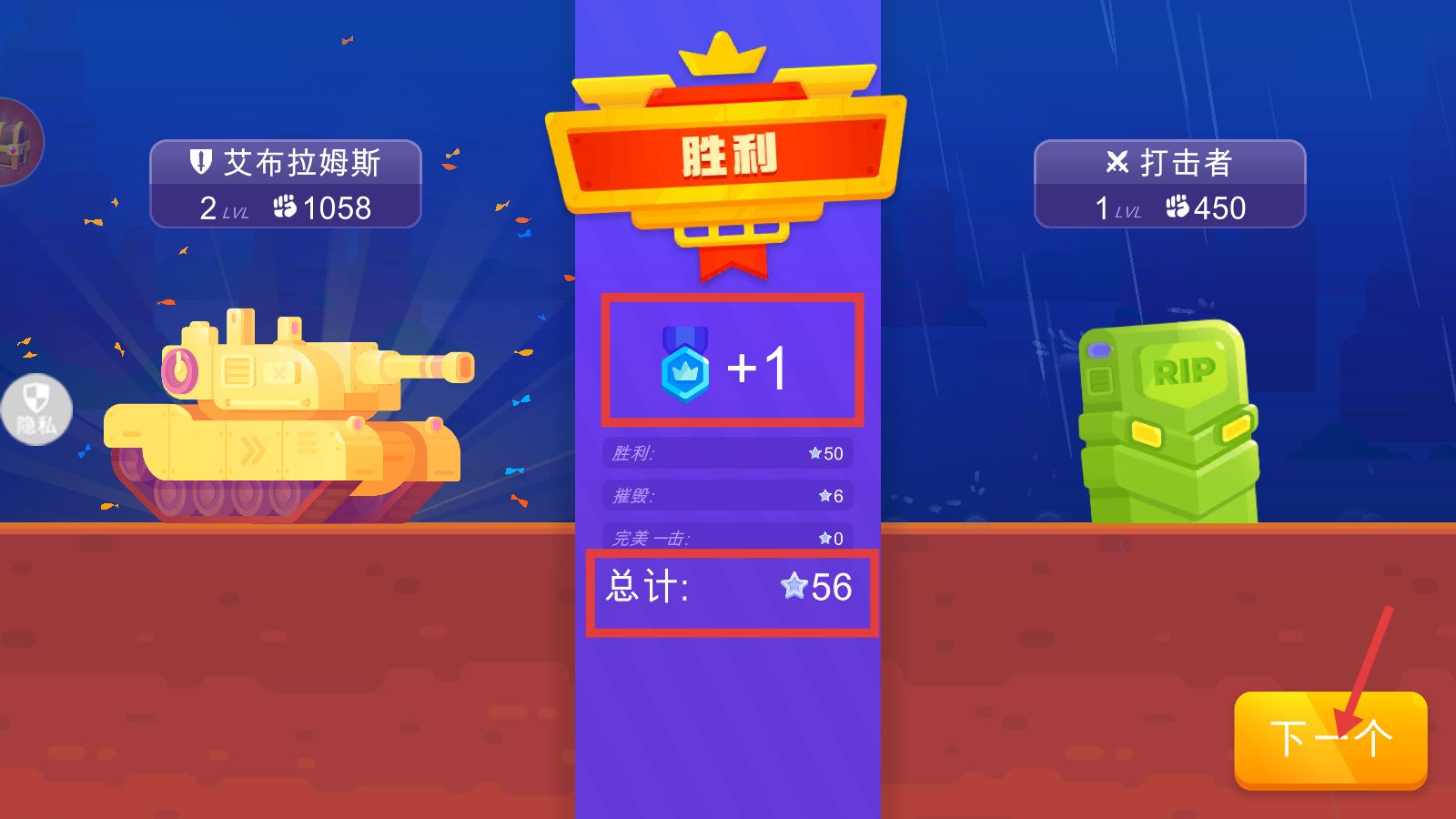 4、成功击败敌方坦克后,会显示【胜利】界面,获得【+1】勋章等奖励,点击【下一个】按钮可继续挑战。