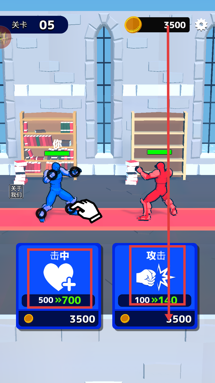 1、关卡05开始,可花费【3500】金币提升“攻击”或“击中”属性,增强角色战斗能力,为对战做准备。
