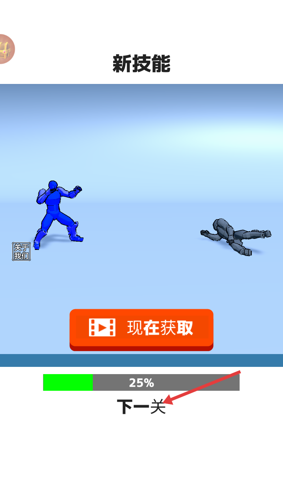 4、通关后会解锁【新技能】,可观看视频获取,也能直接点击【下一关】挑战后续关卡。
