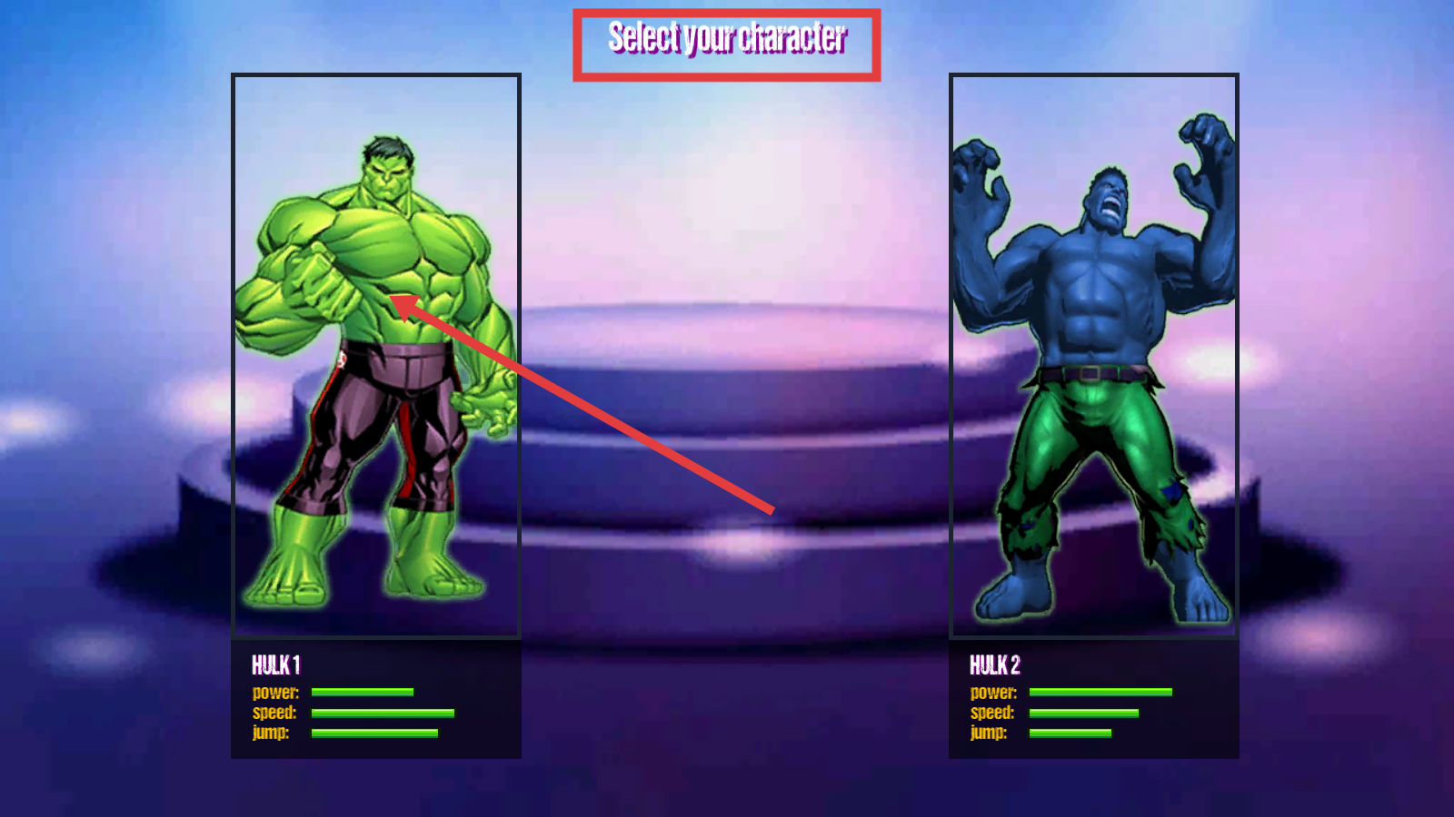1、在【Select-your-character】界面,可选择【HULK-1】或【HULK-2】,根据“power”“speed”“jump”属性挑选适合的绿巨人角色开启游戏。