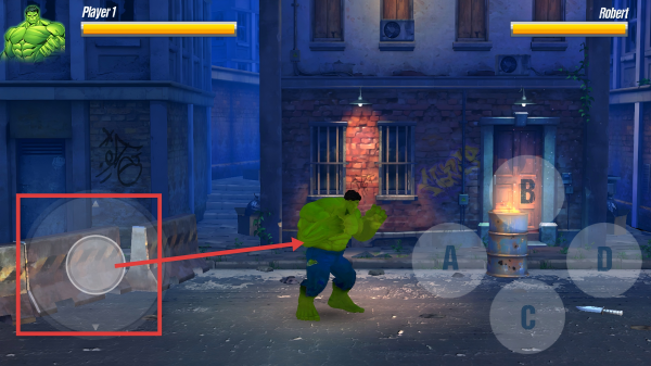 2、进入战斗场景后,通过左侧摇杆控件操控绿巨人移动,调整位置以应对敌人。