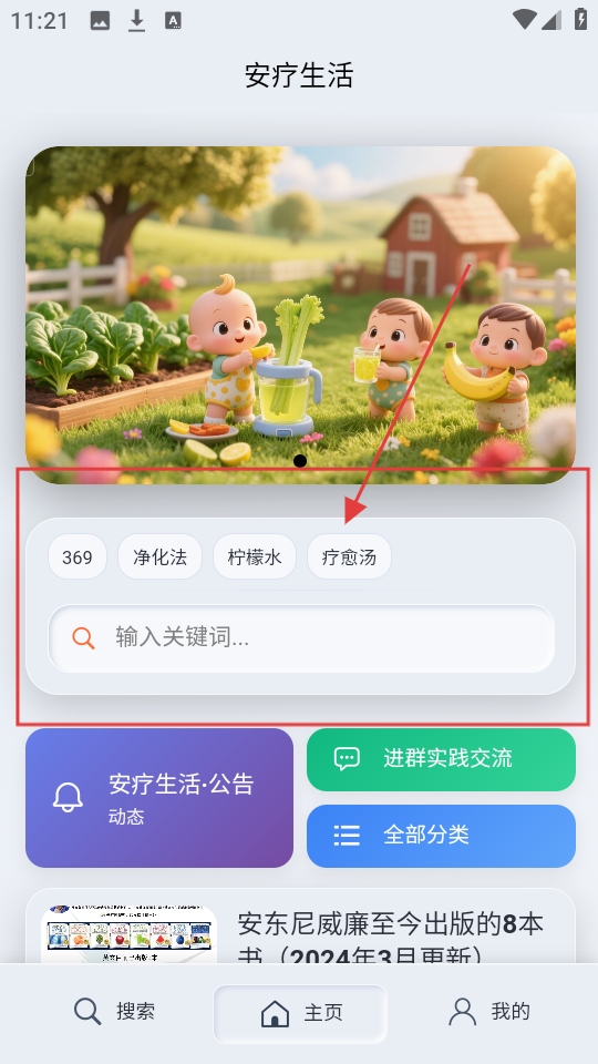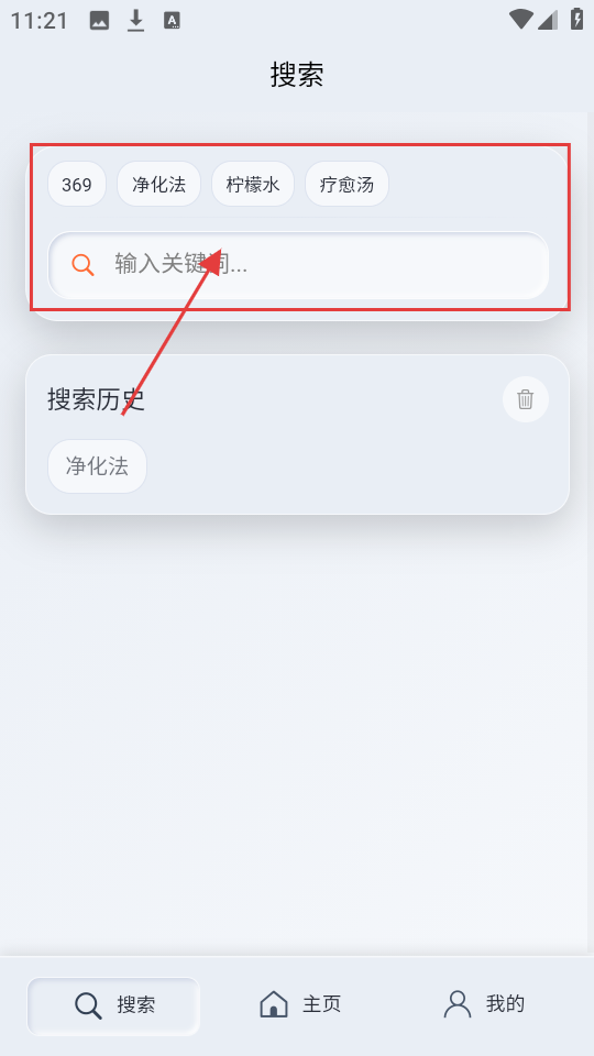 1、在安疗生活主页,有【369】【净化法】等标签,点搜索框,进入搜索页,准备搜索内容。