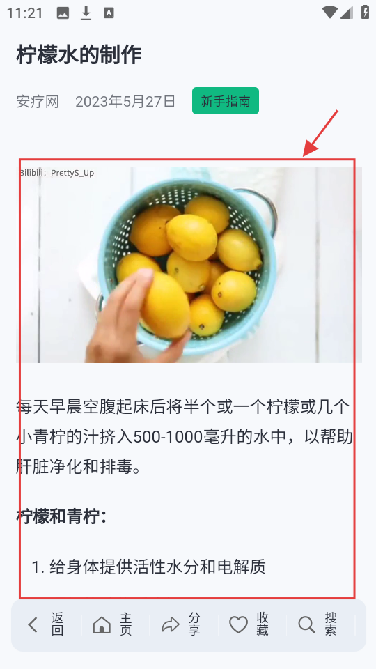 4、在【柠檬水的制作】详情页,查看柠檬水制作方法、作用等内容,学习如何制作柠檬水。