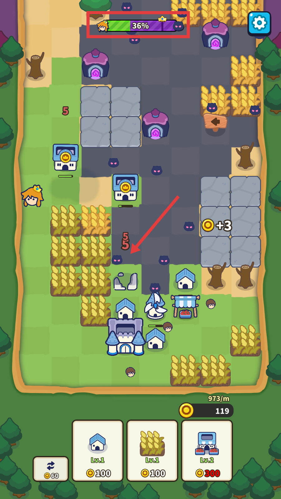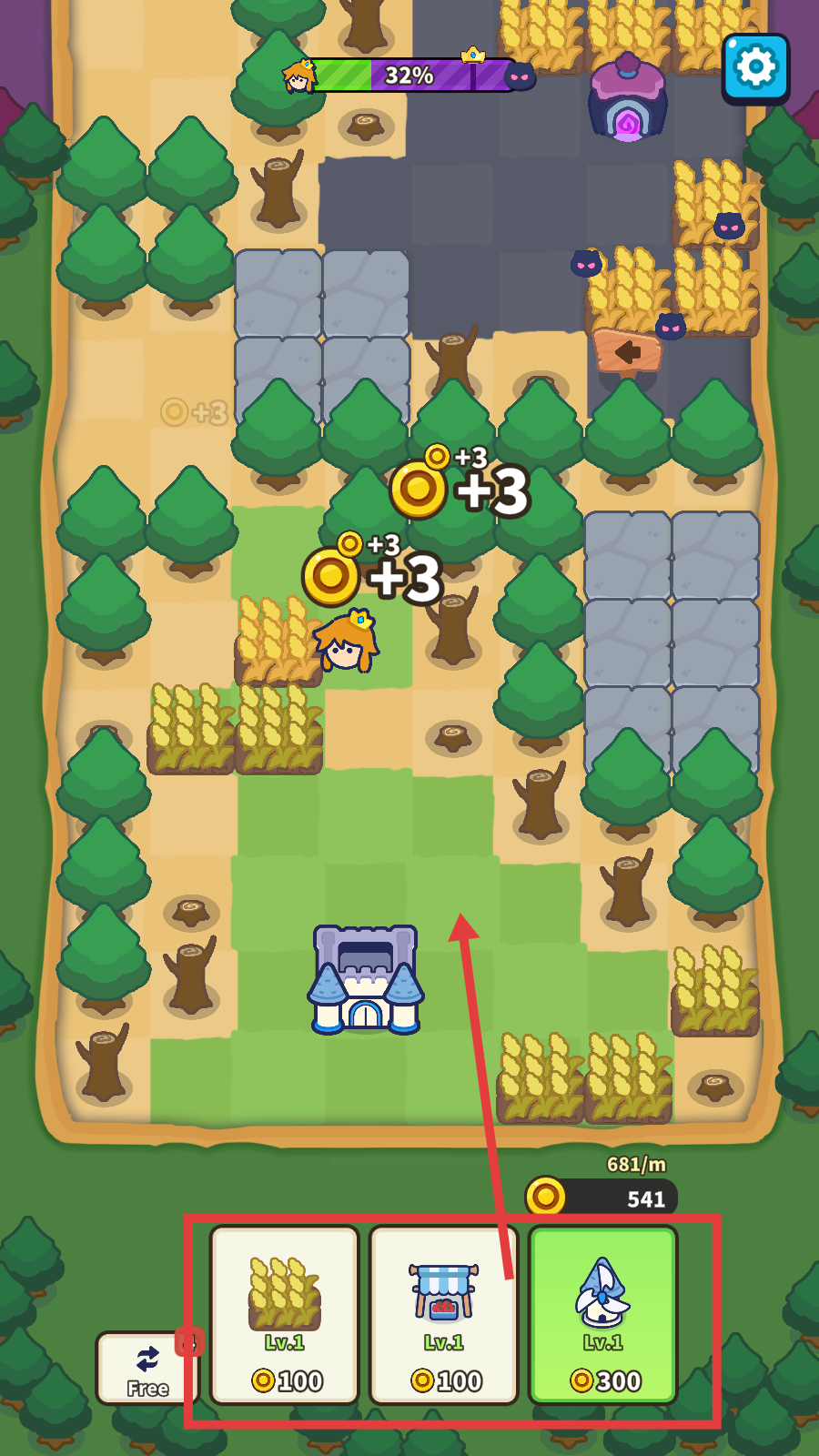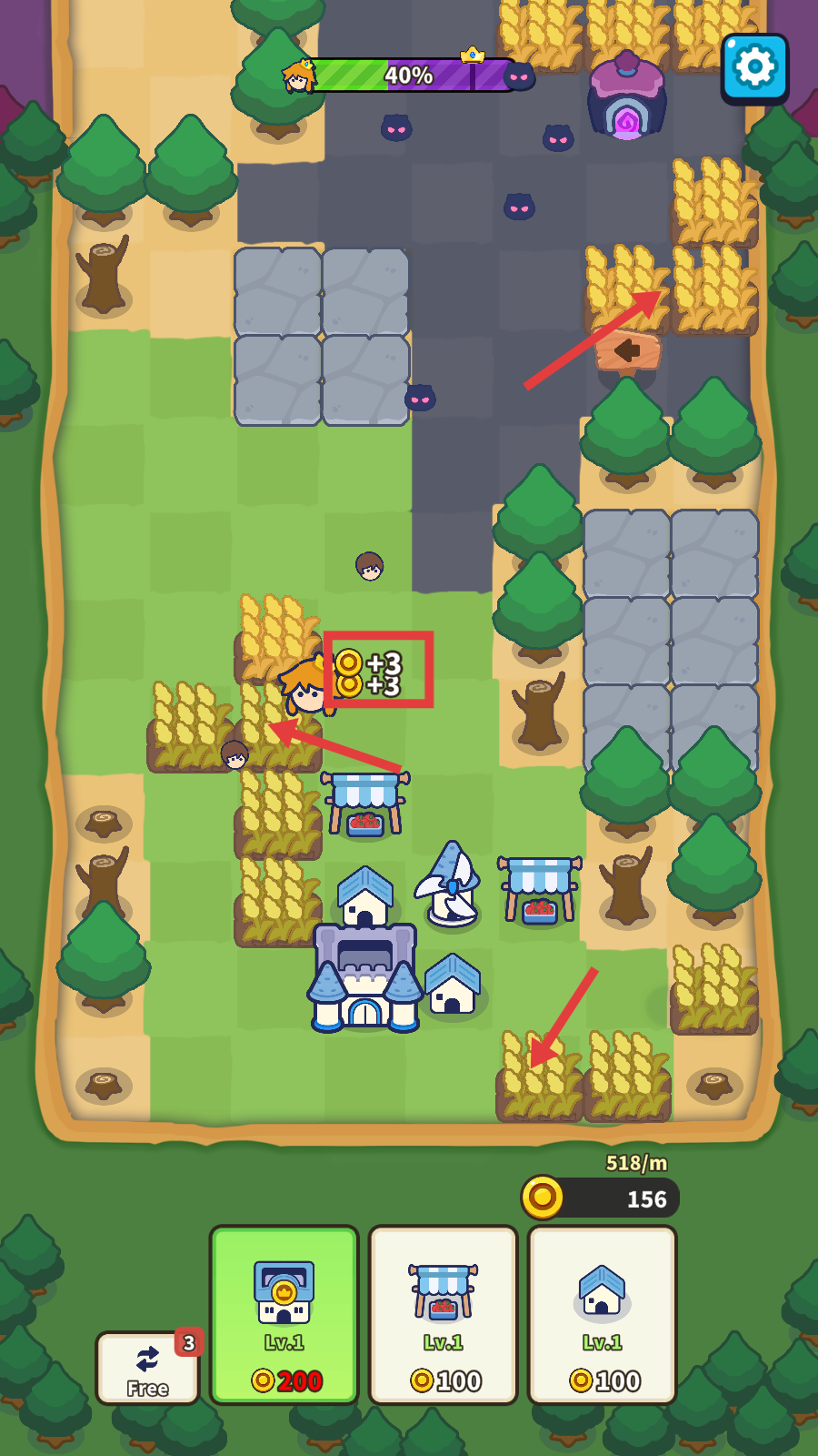 1、初期可消耗金币建造建筑,比如花【100】金币建农田或市场,花【300】金币建风车,以此拓展领地、获取资源。
