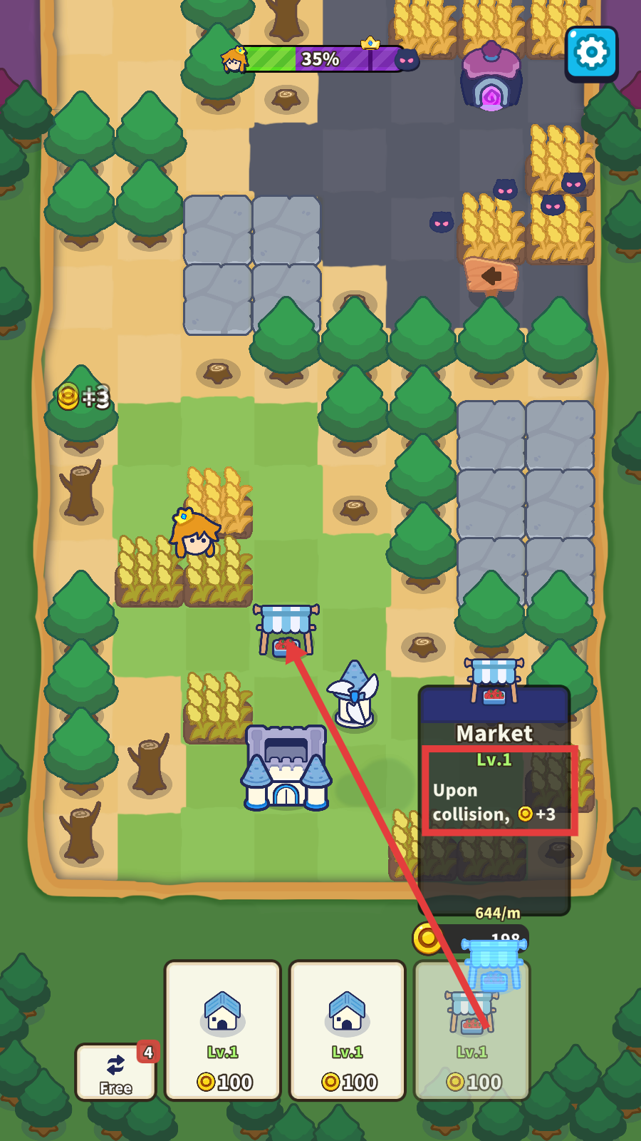 2、建造【Market-Lv.1】后,角色与市场碰撞时,能获得【+3】金币,可多次利用该机制积累金币。