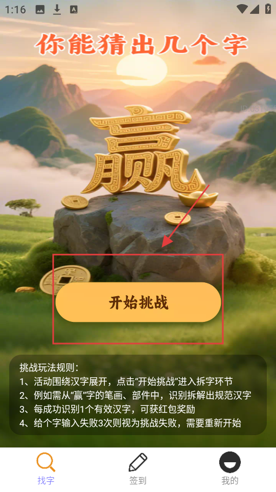 1、汉字游戏闯关:以汉字拆解、识别为核心玩法,设置多难度关卡,每完成一关即可获得红包奖励,兼具趣味性与挑战性。