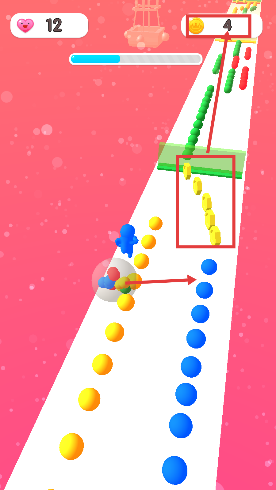 2、在跑道上收集彩色小球,同时尽可能获取黄色金币,积累游戏资源。