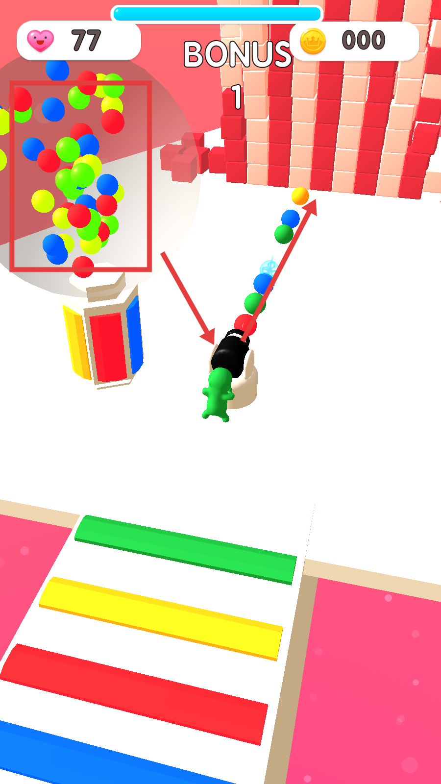 3、操控角色将收集到的彩色小球装入炮筒,瞄准目标发射,击碎前方的方块类障碍物。
