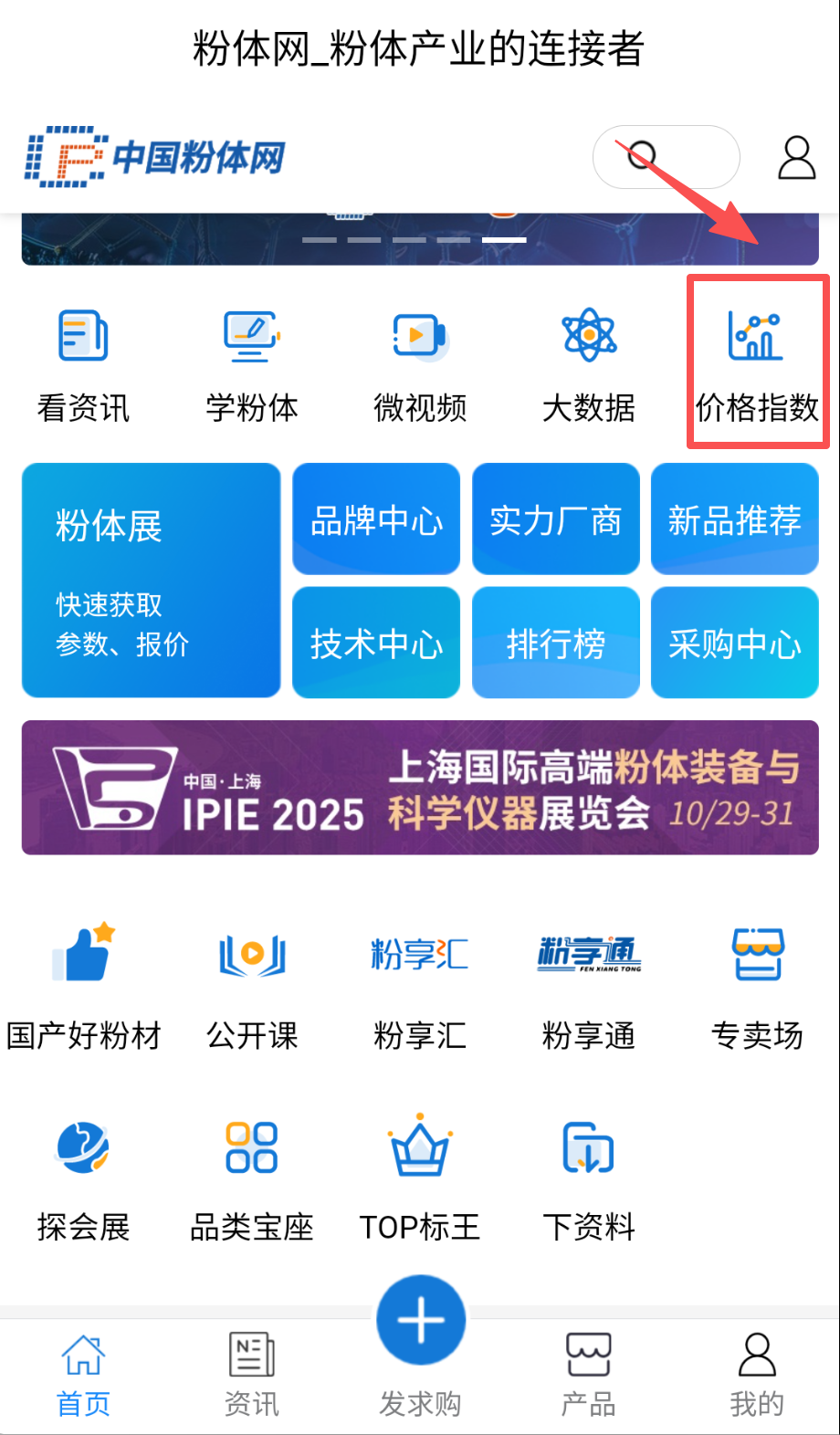 3、 通过"价格指数"查询各类粉体产品实时行情,设置氧化铝、碳酸钙等品种价格波动提醒,结合历史曲线制定采购计划。