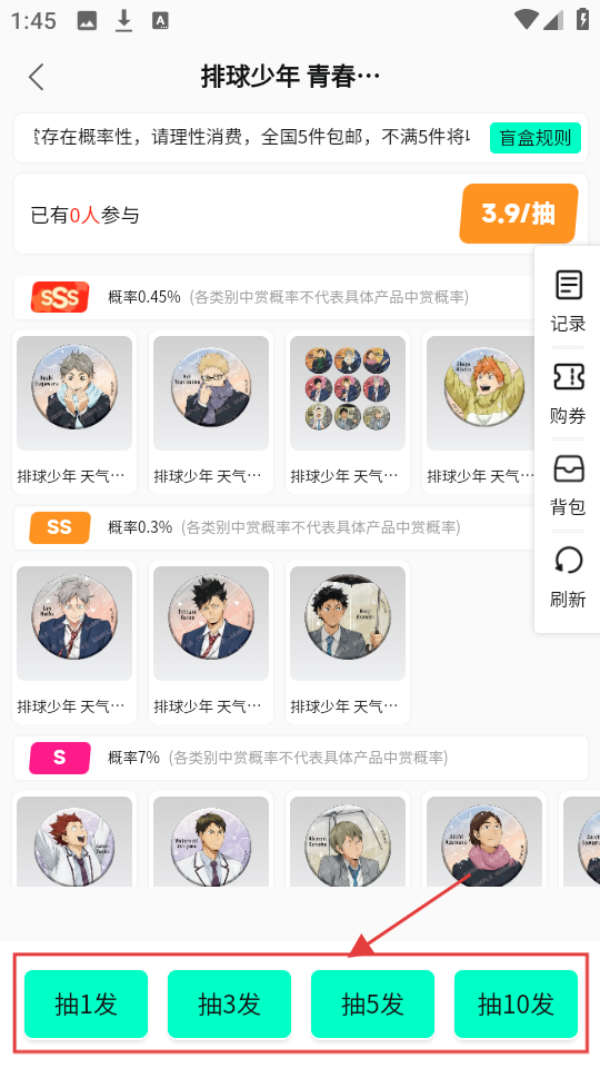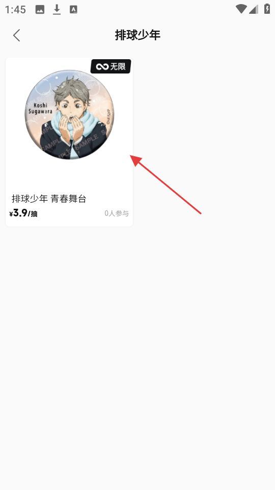 2、在排球少年盲盒页,有“排球少年-青春舞台”盲盒,3.9/抽,点盲盒,进入抽取页。
