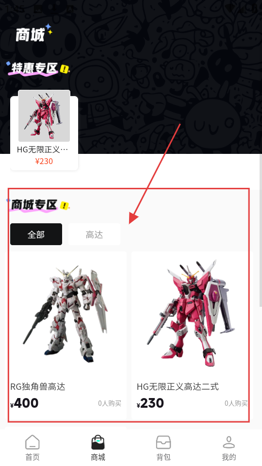 4、到商城页,有【RG独角兽高达】等商品,选喜欢的高达商品,可查看详情或购买。
