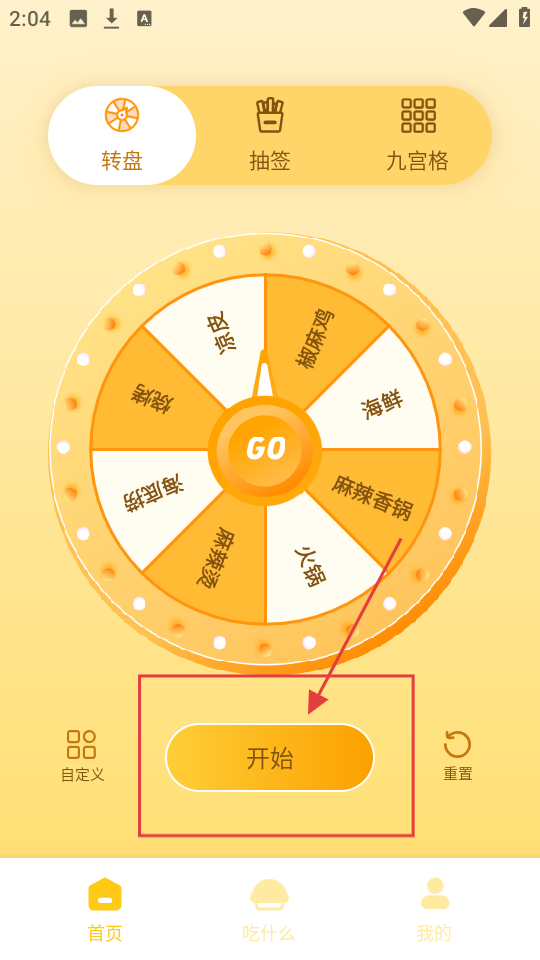 1、在首页,选【转盘】玩法,转盘有火锅、麻辣烫等选项,点【开始】,转盘转动。