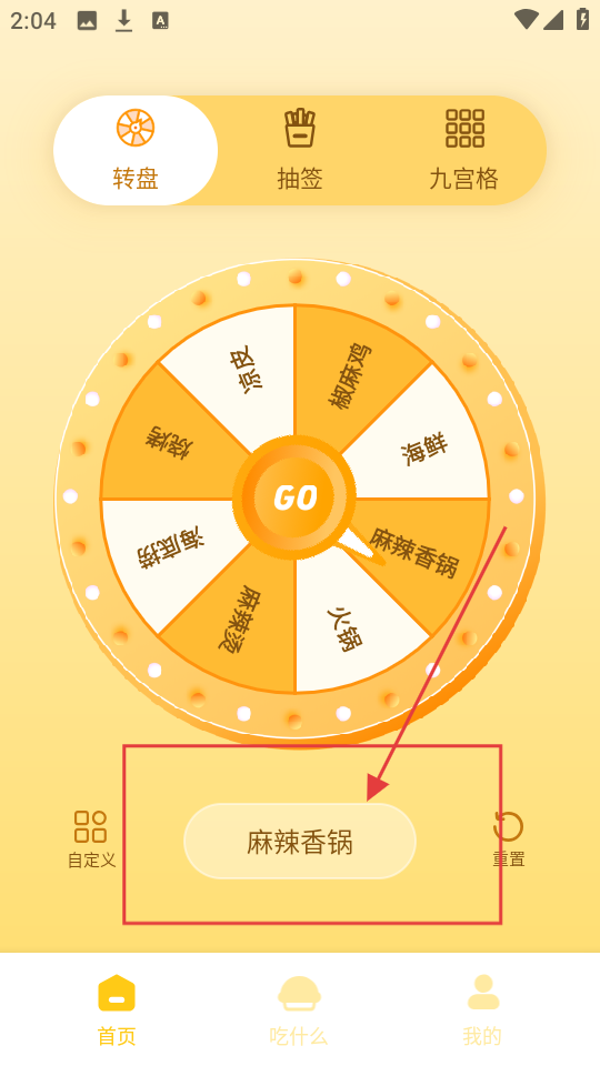 2、转盘停止后,指针指向【麻辣香锅】,即选中该选项,可根据结果决定吃什么。