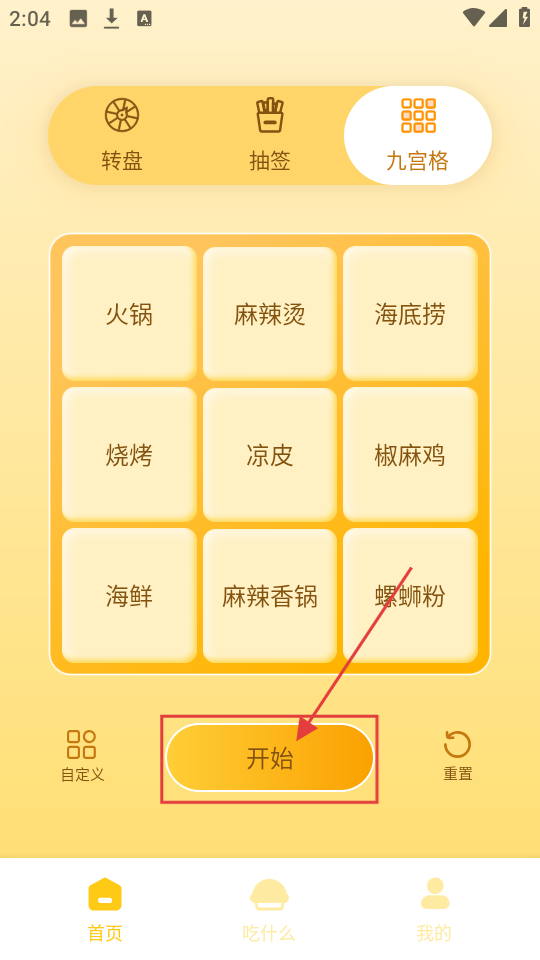 3、切换到【九宫格】玩法,九宫格有火锅、麻辣烫等选项,点【开始】,进行选择。